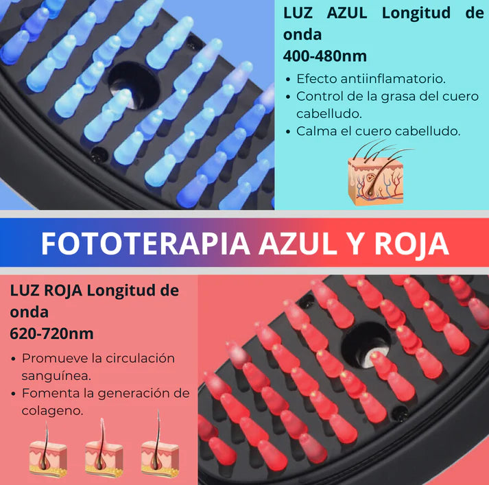 La luz azul hidrata intensamente tu cabello, mientras que la luz roja o protege y fortalece, mejorando su calidad y volumen.